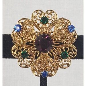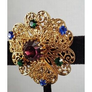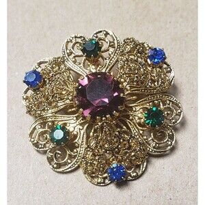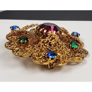 This Vintage Czechoslovakia gold tone filigree pin with RGB (red, green, blue) stonesTypically refers to a Piece of Costume Jewelry, ofter from the mid-20th century, featuring a decorative metal Filigree design and colorful glass stones. These brooches are known for their intricate detail and the use of colorful, often faceted, glass stones.