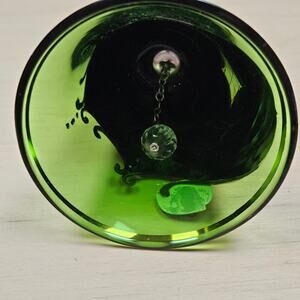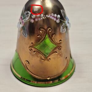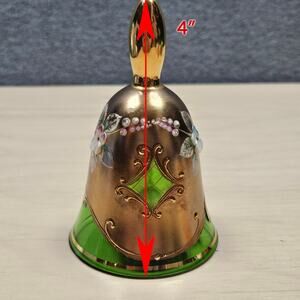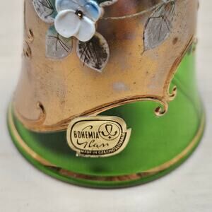 Czechoslovakian Hand Painted Bohemian Glass Bell Green Gold Enameled Flower READ