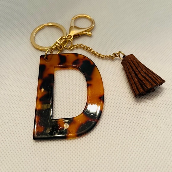 Gold keychain with leopard print acrylic alphabet and tassel. Letter measures approx 2.5 inches tall and 1.5 inches wide.
