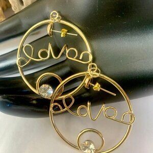 D' Bello gold-tone hoop earrings with LOVE across the center and a single large rhinestone on each.