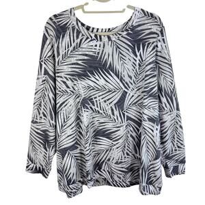 Excellent preowned condition. Gray & white palm leaf print long sleeve round neck soft stretchy pullover top. Polyester/rayon/spandex material. Approx. measurements: Shoulder to hem 30", pit to pit 28", sleeve from neck to sleeve hem 32". Size 2X.