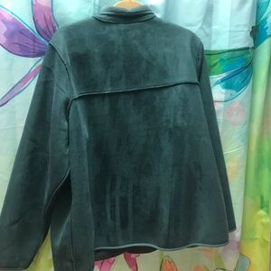 Denim and company canyon retreat jacket. Beautiful dark green forest color. Extremely soft material and snap front. Would be warm! 27” arm pit to armpit. And 30” in length. I have a cat but he has no access to coat, but I have worn it so there may be a stray hair. Also exmoker in house but no smells I can detect.