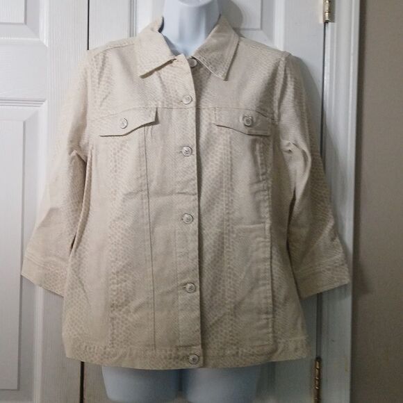 D & Co Denim and Co tan white snakeskin print denim jacket Sz S NWOT