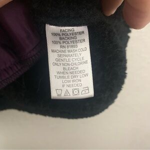 Used in great condition, no stains or tears. Purple Outer is Suede-Like and Black inner is medium pile for warmth. 100% Polyester.