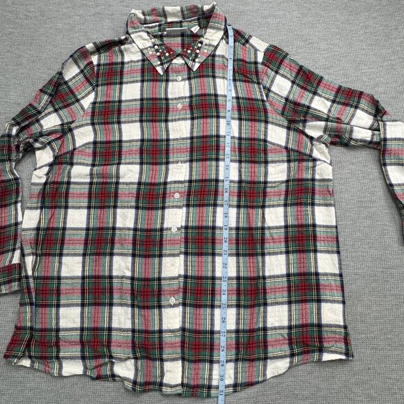 D & Co Womens Size 1X Plaid Flannel Button Up Shirt Embellished Collar Tunic
