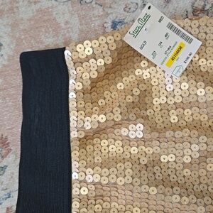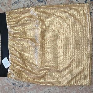 Shimmer in style with this stunning gold sequin straight skirt from D Collection. Perfect for any occasion, it adds a touch of glamour to your wardrobe. Wide black waistband. Pull on style. Fully lined. 100% polyester. Size Medium. Approximate measurements 16" across waist unstretched. 21" across hips. 22" long. New with tags