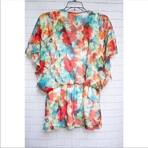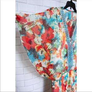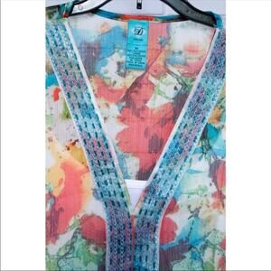 D Collection floral watercolor print blouse. Sheer overlay with white camisole underneath. There are blue beads in the trim. Perfect for spring! Light and airy!