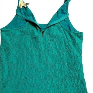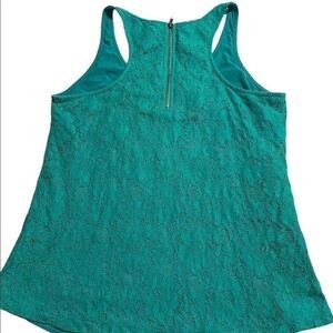 Y2K Teal nylon mesh with floral cotton over mesh, lined racer back tank with back zip detail. Teal matching polyester lining. Size medium, Chest 34”, length 24.5”. Not really any give to this garment as it has no spandex. True to measurements. GUC.