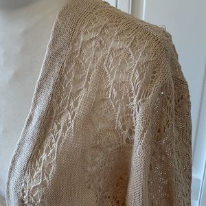 Beautiful Italian Design Boho Chic ecru cotton/linen blend crocheted long cardigan; mother of pearl buttons, size Large; excellent unworn condition.