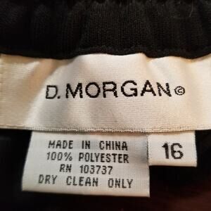D Morgan - 2 Piece Black Suit Set, Skirt & Sleeveless Top Floral Embellished Top - Size 16; Material - Top & Skirt 100% Polyester.; Care - Dry Clean Only; Skirt and Top are Fully Lined; Top has Full Length Zipper Closure, Skirt Has Zipper and Hook & Eye Closure, Elastic on Back Waist Band, A Line Style Skirt, Skirt has 7 inch slit back Hem Line. Flat Front Waist Band, Darts Front & Back.