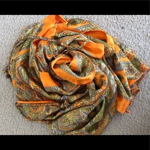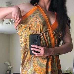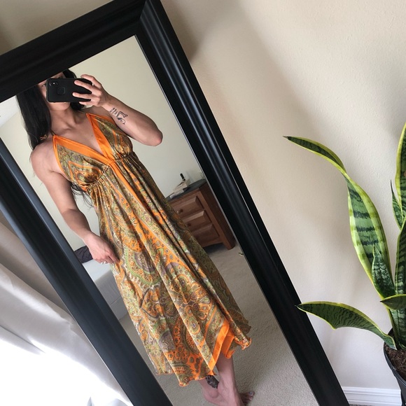 100% polyester but feels silky! Orange w/ green/purple paisley design, shark bite hem & lots of flowing fabric! This would be a cool prop for a photographer as this dress would be able to fit a wide range of women and bust sizes! See photo 5 and 6, the tie goes under the bust allowing for a very adjustable and custom fit! This dress would also be great for someone on a weight loss journey, or pregnant! This dress will adjust to your changing body. EUC. Halter tie at neck, shoes a little back!