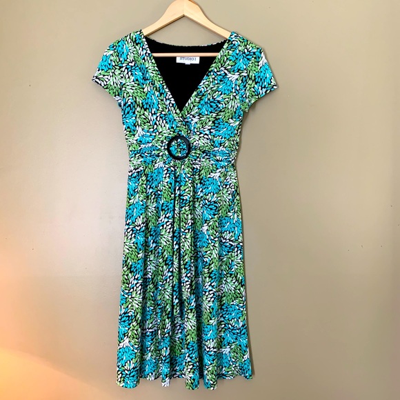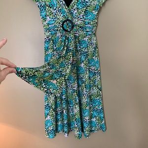 A dress just right for going to the office or even to a wedding. Hugs the body and gives your waistline some definition with the ruching and faux bow/belt detail in front. Gently worn. True size. Knee length.