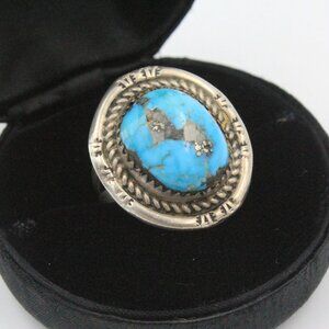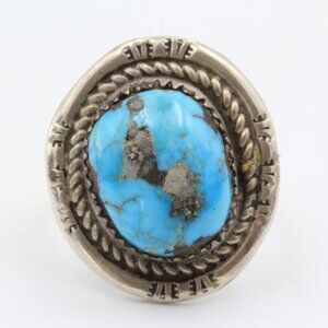 Discover a true vintage gem with this exquisite Navajo ring, dating back to the 1960s. Meticulously crafted from sterling silver, it boasts intricate rope-like designs and showcases a mesmerizing Morenci turquoise stone at its center. The piece bears the distinctive marking "WHITEGOAT," adding to its authenticity. While it exhibits the expected signs of tarnishing over time, it still retains its timeless allure. With a comfortable size 7 fit, a generously sized 12mm by 15mm stone, and a weight of 8.28 grams, this Navajo ring is a captivating blend of craftsmanship and history.