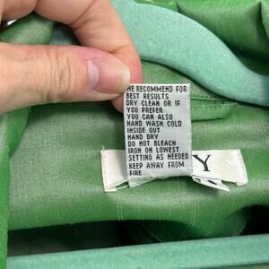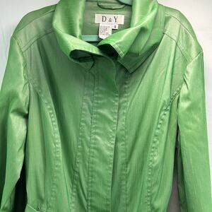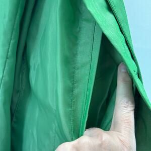 D & Y women’s small green bubble long coat with belt. Coat is a unique style with high neck, zips and snaps, usable, front pockets, and inside pocket, stain on backside of sleeve. See pictures and measurements as part of description and sizing.