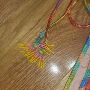 Brazilian bikini bottom features a ribbed chevron fabrication and offers beaded tassel ties at hips and minimal coverage.