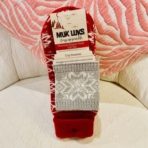 -NEW WITH TAGS Cozy knit thermal Fair Isle patterned slipper socks. Material: Slipper Sock: 92% Acrylic, 6% Polyester, 1% Rubber, 1% Spandex; Cup Sweater: 100% Acrylic.Machine Washable