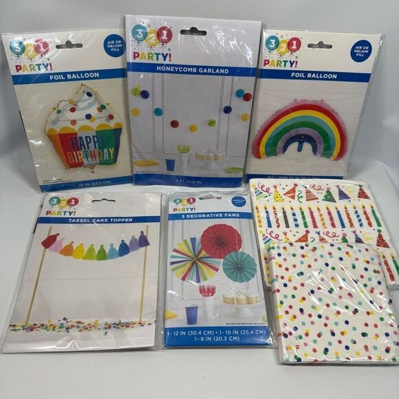 D29 Party Decorations- 7 piece Rainbow party decor - balloons, napkins, garland, fans, cake topper