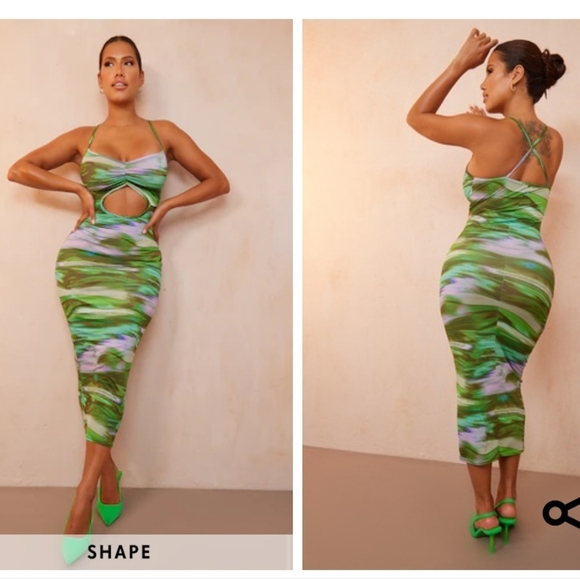 D5. NWT PRETTYLITTLETHING Green Wave Slinky Ruched Bust Cut Out Midaxi Dress