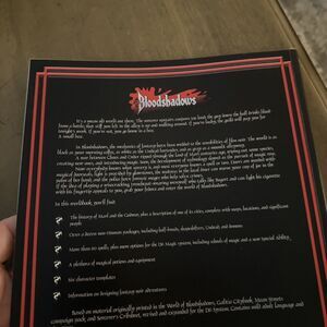 With detailed descriptions of characters, locations, and creatures, this worldbook is a must-have for any serious D6 Bloodshadows player. Whether you're a seasoned veteran or a curious newcomer, the rich and detailed world of D6 Bloodshadows is sure to capture your imagination and keep you engaged for hours on end.