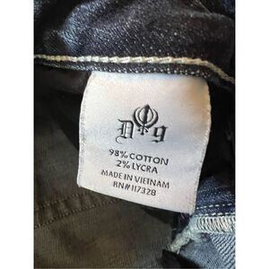 Slick bootcut jeans from D9. Whiskering and fading, zip fly, classic 5 pocket styling. Distressing on fabric, lots of decorative black rhinestone studs. Button flap back pockets embellished with studs and rhinestones. D9 signature logo patch on back waistband.