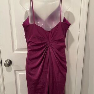 Elegant magenta evening gown with flattering draped ruching along the front and side.