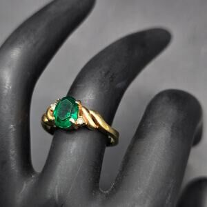 This vintage ring features a green glass rhinestone in the center of a gold tone twisted band accented with clear glass rhinestones.