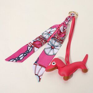 Add a playful touch to your purse with this charming dachshund-shaped bag accessory, paired with a luxe tassel and printed scarf detail.