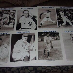 This collection includes 19 8 x 10 pictures of Yankee greats.On one side of each is artwork by Bill Gallo of the baseball great on the other side a photo of that great.