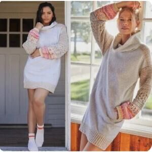 This Anthropologie sweater dress is a cozy and stylish addition to your wardrobe. The long-sleeved dress features a beautiful embroidered design on a solid gray cotton blend material. It has a flattering cowl neck and a pullover closure, making it easy to wear for any occasion - whether you're traveling, going to a party, or dressing up for a more formal event.