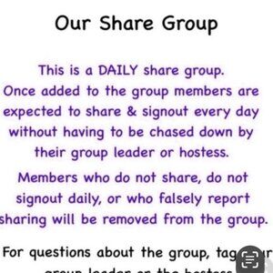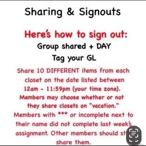 SHARE 10 different, available items from all closets listed in your assignment BETWEEN 12am - 11:59pm (your time). Members choose whether or not they share “VACATION” closets. Members who do not share, sign out, or have non compliant items will be removed from the group. GLs are VOLUNTEERS who help keep our group strong. Time spent following up, checking shares, reporting out, is time they could be spending on their own closets. Please respect their time & don’t make them chase you for sign outs.