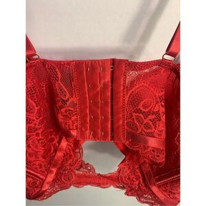 Daisy Fuentes red lace bra- underwire- size 36B- push up- bra has stretch lace panel underneath cups for a sexy corset look- Red ribbon bow in center of cups- straps are adjustable - Five hook and eye closure - wide band around sides and back - band is totally lace with ribbon trim - lace is stretchy- 90% nylon 10% elastane- TAGS REMOVED BUT NEVER WORN - NWOT
