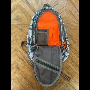 Front zip has mesh pockets and slip pockets for organization. Main compartment has small zippered top pocket