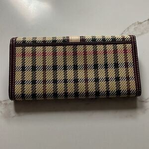 Classic DAKS London wallet clutch featuring the iconic plaid check with genuine burgundy leather trim and gold-tone hardware. This timeless piece can be used as a long wallet or clutch, perfect for both everyday use and special occasions.