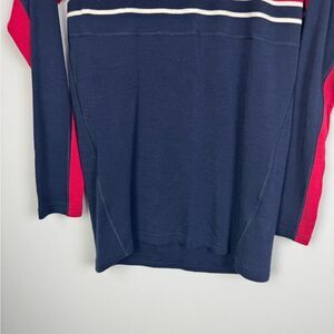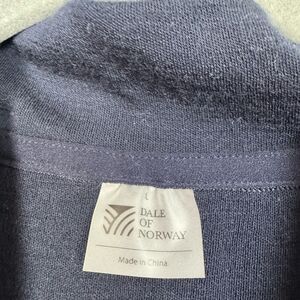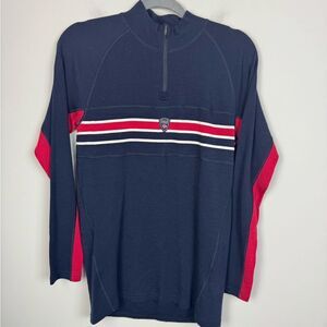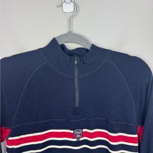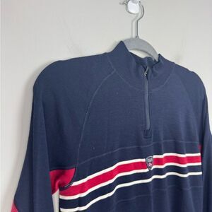 Awesome 100% wool pullover by Dale of Norway. Quarter zip. Lightweight sweater. Dark blue with red and white accents. Great condition!! Men’s size large (fits on the smaller side).