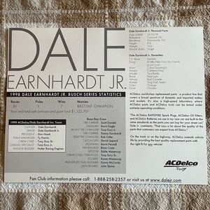 The back side includes 1998 Dale Earnhardt Jr. Busch Series Statistics, Personal Facts, Favorites