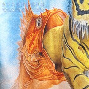The print quality is good but the source image used was enlarged making it's digitizing visible and resulting in a somewhat blurred image. The upper blue section of the t-shirt appears to have faint spots (difficult to see in photos) that also extend to the collar but the spots are actually the soft clouds in the artwork.