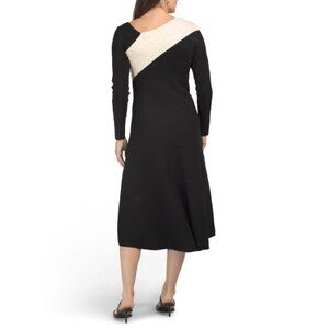 Brand New Color: Black/cream fabric provides stretch, color block detail, knit accents, soft and warm long sleeve, asymmetrical neckline, maxi dress 49in long, taken from size S pull on polyester/spandex imported hand wash