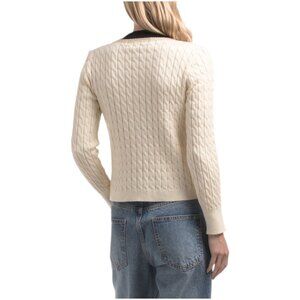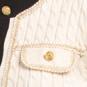 metallic accents, cable knit details, ribbed collar, cuffs and hem, button front closure, gold tone buttons, fabric provides stretch