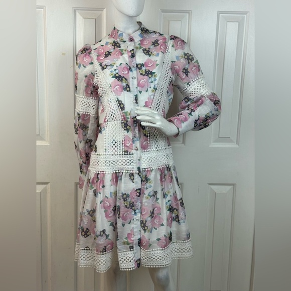 Elegant floral dress featuring a blend of pink and white hues. Perfect for any occasion with its stylish design and comfortable fit dress in good condition missing waist belt.