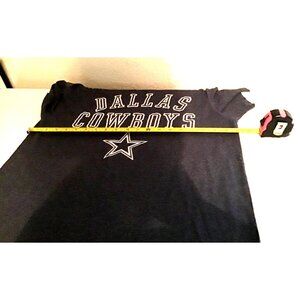 Official Dallas Cowboys men's T-shirt in size medium. Features a crew neck, short sleeves, and bold graphics on a vibrant blue backdrop. Composed of 50% cotton for comfort and durability.