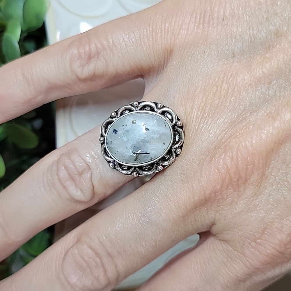 Genuine stone with natural inclusions; scalloped vintage trim; sterling silver overlay.