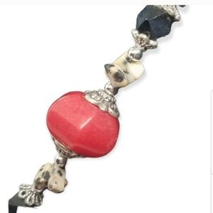 Beautiful necklace made with large red agate stones,carved black onyx stones, and dalmation jasper stone chips with silvertoned spacers. This ornate quality necklace measures 19 inches in length and has a spring clasp style closure.