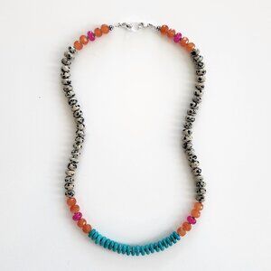 Necklace made with a mix of turquoise (3x8mm), orange colored jade (5x8mm), fuchsia colored jade (5x8mm) and natural Dalmatian jasper (5x8mm).