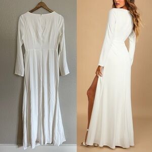 Lulus Romance for the Ages White Long Sleeve Maxi Dress! Sleek woven fabric shapes this dress that has a plunging V-neck (with mesh insert), a princess-seamed bodice, and long sleeves. Light gathering at the waist tops a maxi skirt with a thigh-high front slit. Hidden back zipper/clasp.