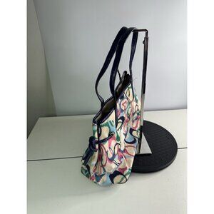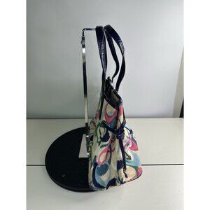 The Coach F24453 Ikat Large Carryall in multicolored signature canvas and leather is a stylish medium-sized handbag for women. It features navy blue leather straps with silver hardware, a beige lining, and a sophisticated magnet and zipper closure. The signature ikat design adds a touch of flair to this versatile carryall, making it a must-have accessory for any fashion-forward woman.