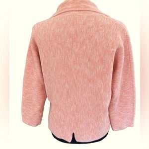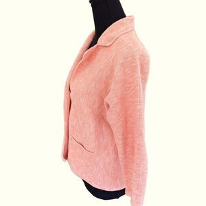 DAMASK peach/ white cotton blend button front jacket size M. Cotton/ nylon blend knit, collar with 2 button front and patch pockets, 3/4 sleeves. Great to have over a tank or a dress. Approximate measurements are pit to pit 20”, length from shoulder approximately 21”.