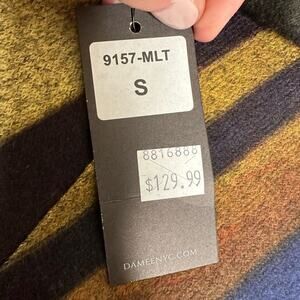 This tunic showcases a vibrant geometric pattern in blue purples, pinks, and gold, offering a bold and artistic flair. Its oversized, boxy design with a mock neckline ensures a modern and comfortable fit. The smooth knit fabric drapes elegantly, making it a versatile addition to any wardrobe.