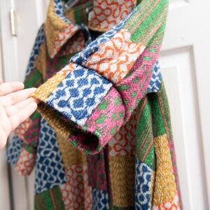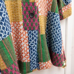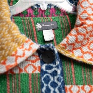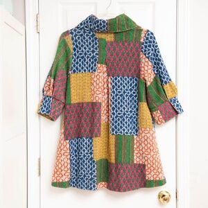Wow! This Jacket by Damee Inc is EPIC! Originally $175, this vintage style coat features a retro block pattern with abstract designs! The large black buttons are a perfect accent. The collar and detailed sleeves are beyond fashionable! This jacket is a size medium, and is very attractive on! It flows away from the body creating a slimming hour glass shape. Absolutely amazing piece! Basically like new! No obvious wear!