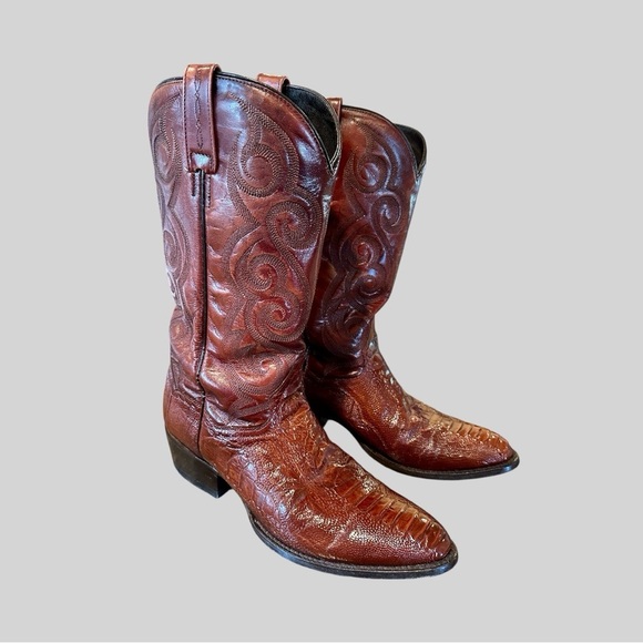 DAN POST, #26636, MENS, BELLEVUE, WESTERN BOOT IN 100% LEATHER. RUBBER SOLE, GENUINE OSTRICH LEG, LEATHER FOOT, COMFORT FLEX CUSHION INSOLE, R TOE, COWBOY HEEL, DETAILED STITCHING. REDDISH BROWN COLOR. 13” SHAFT HEIGHT. IN VERY GOOD CONDITION. SIZE 9