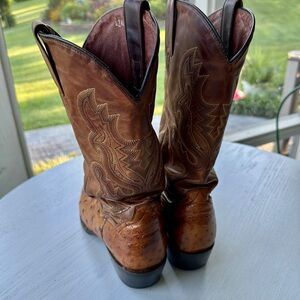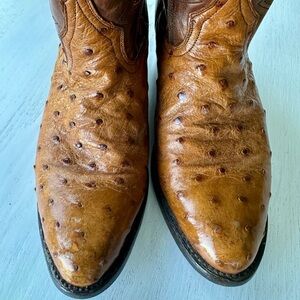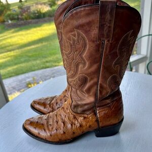 DAN POST, GENUINE FULL QUILL OSTRICH & LEATHER MENS BOOTS. DECORATIVE STITCHING